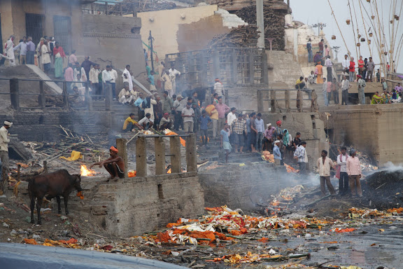 Runter zu den Ghats. Hier ist auch eines der beiden großen Verbrennungsplätze der 3200 Jahre alten, heute inzwischen Millionenstadt. Durch die Gassen werden immer neue Tote getragen und die zig Feuer am Ganges brennen 24h, 365 Tage im Jahr. Deren beißender Rauch überdeckt auch den Duft der hunderten Räucherstäbchen. Vor der Verbrennung wird die/der Tote in den Fluss getaucht und nachdem die Angehörigen 5x um den Leichnam gelaufen sind, geht dieser in Flammen auf . Nach 2h ist der Platz wieder frei. Dem nächsten Angehörigen des Toten wird zum Zeichen der Trauer der Schädel geschoren und das war's. Bleibt die Hoffnung, daß das nächste Leben besser wird...